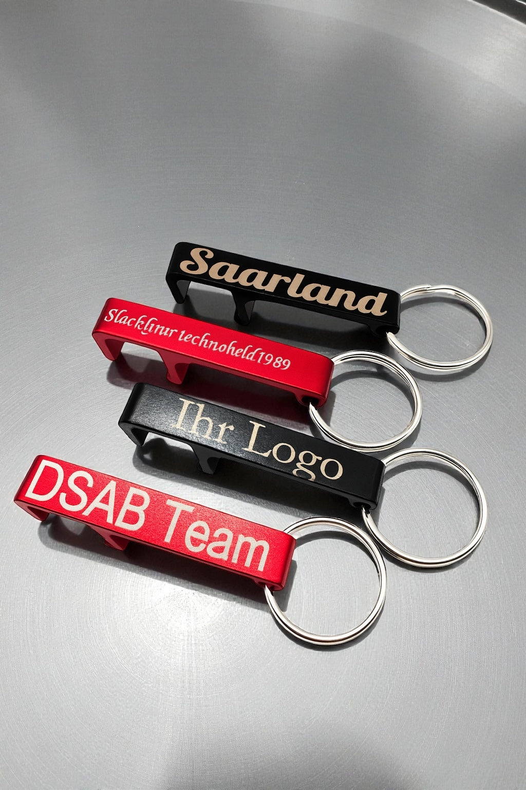 Praktisch, leicht und individuell – unser hochwertiger Flaschenöffner aus Aluminium ist der perfekte Begleiter am Schlüsselbund. In elegantem Rot oder Schwarz und mit Ihrer Wunschgravur wird er zum persönlichen Accessoire oder idealen Werbegeschenk!